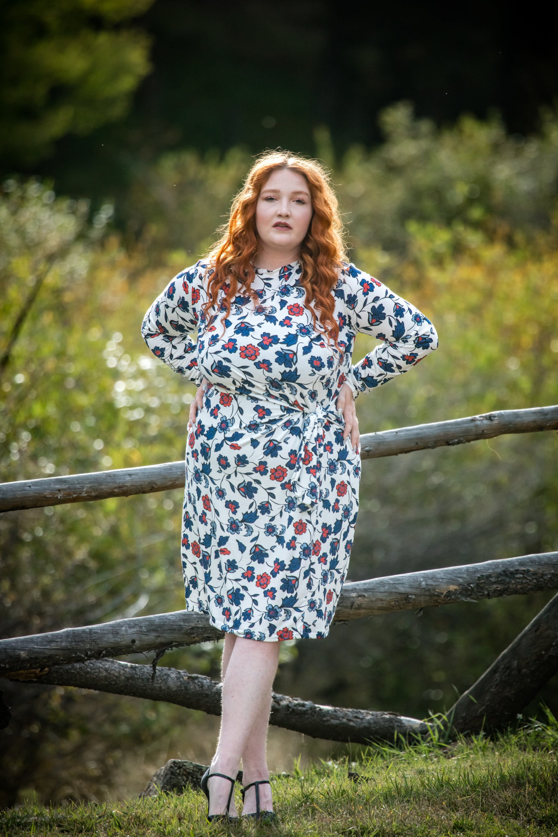 There is more to this simple long sleeved knit dress than meets the eye. With a feminine silhouette and well-placed rouching under the bust, it flatters every body type, and works for day or night. This beautiful burgundy and blue floral print is sweetly eye-catching and perfect for Fall. Crafted from a deadstock polyester/spandex blend.
